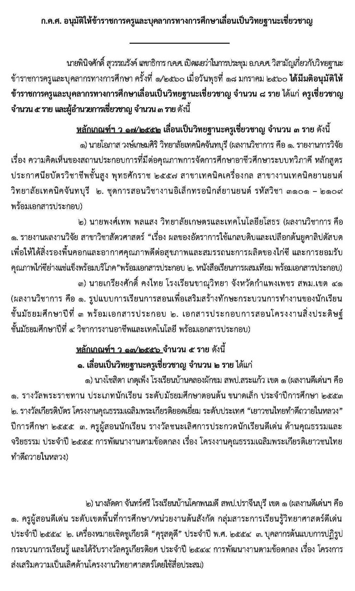 นายพินิจศักดิ์ สุวรรณรังค์ เลขาธิการ ก.ค.ศ. เปิดเผยว่าในการประชุม อ.ก.ค.ศ. วิสามัญเกี่ยวกับวิทยฐานะ ข้าราชการครูและบุคลากรทางการศึกษา ครั้งที่ ๑/๒๕๖๐ เมื่อวันพุธที่ ๑๘ มกราคม ๒๕๖๐ ได้มีมติอนุมัติให้ ข้าราชการครูและบุคลากรทางการศึกษาเลื่อนเป็นวิทยฐานะเชี่ยวชาญ จานวน ๘ ราย ได้แก่ ครูเชี่ยวชาญ จานวน ๕ ราย และผู้อานวยการเชี่ยวชาญ จานวน ๓ ราย ดังนี้
