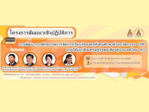 คณะศึกษาศาสตร์ สาขาวิชาสังคมศึกษาขอเชิญผู้ที่สนใจเข้าร่วมโครงการสัมมนาเชิงปฏิบัติการ ในหัวข้อเรื่อง “การพัฒนาศักยภาพการจัดการเรียนรู้ของครูสังคมศึกษาด้วยนวัตกรรม CRP ภายใต้แนวคิดเศรษฐกิจพอเพียงสู่ประเทศไทย 4.0”