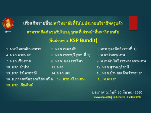 เพิ่มเติมรายชื่อมหาวิทยาลัยที่รับใบประกอบวิชาชีพครูแล้ว สามารถติดต่อขอรับใบอนุญาตที่เจ้าหน้าที่มหาวิทยาลัย