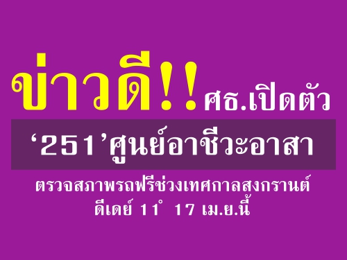 “ศูนย์อาชีวะอาสา มีจุดสังเกตเป็นเต็นท์สีม่วง และมีป้ายบอกทางเป็นระยะ ๆ ตั้งแต่ ‘1 กิโลเมตร’ ‘500 เมตร’ และ ‘ถึงแล้ว’ ก่อนถึงเต็นท์ ภายในศูนย์ จะให้บริการตรวจสอบสภาพความพร้อมของเครื่องยนต์ ปรับแต่งเครื่องยนต์ เปลี่ยนหลอดไฟ สัญญาณไฟ ตรวจ/เติม น้ำกลั่น น้ำมันเครื่อง น้ำมันเบรก น้ำมันครัทช์ เติมความดันลมยาง และทำความสะอาดไส้กรองอากาศ เพื่อให้มีความพร้อมในการเดินทางอย่างปลอดภัย รวมทั้งให้บริการสอบถามข้อมูลเส้นทาง สถานที่ท่องเที่ยว ที่พัก ร้านอาหารและเครื่องดื่ม ชา กาแฟ ที่นั่งพักผ่อน” นายสุเทพ กล่าว และว่า ขอเชิญชวนประชาชนที่เดินทางกลับบ้านหรือท่องเที่ยวตรวจสภาพรถยนต์/รถจักรยานยนต์ฟรี 251 ศูนย์ บนถนนสายหลัก-และสายรองทั่วประเทศ โดยสอบถามข้อมูลเพิ่มเติมได้ที่โทร 09-8209-7478 และ 08-5906-5499 หรือเว็ปไซต์ www.vec.go.th หรือแอพพลิเคชั่นแอนดรอย ‘อาชีวะอาสา’