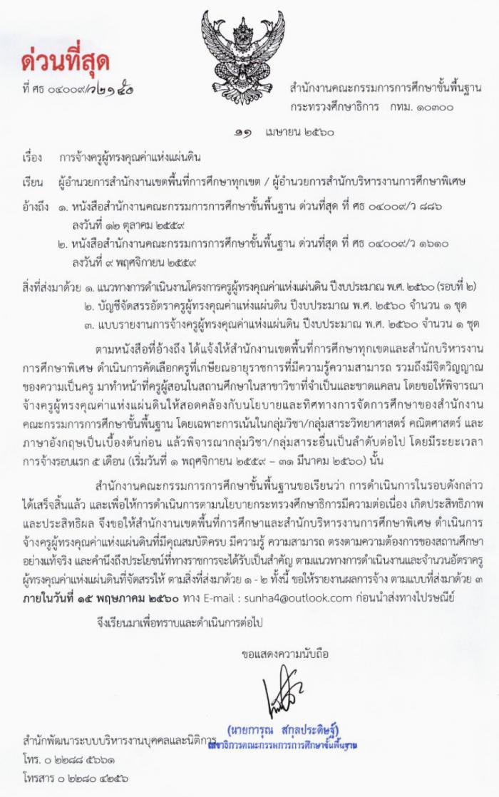 ด่วนที่สุด ที่ ศธ 04009/ว2150 ลงวันที่ 11 เมษายน 2560 เรื่อง การจ้างครูผู้ทรงคุณค่าแห่งแผ่นดิน
