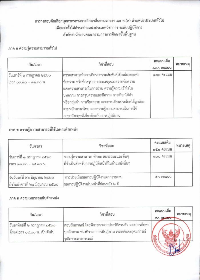 ตารางสอบคัดเลือกบุคลากรทางการศึกษาอื่นตามมาตรา 38ค.(2) ตำแหน่งประเภททั่วไปเพื่อแต่งตั้งให้ดำรงตำแหน่งประเภทวิชาการ ระดับปฏิบัติการ สังกัด สพฐ.