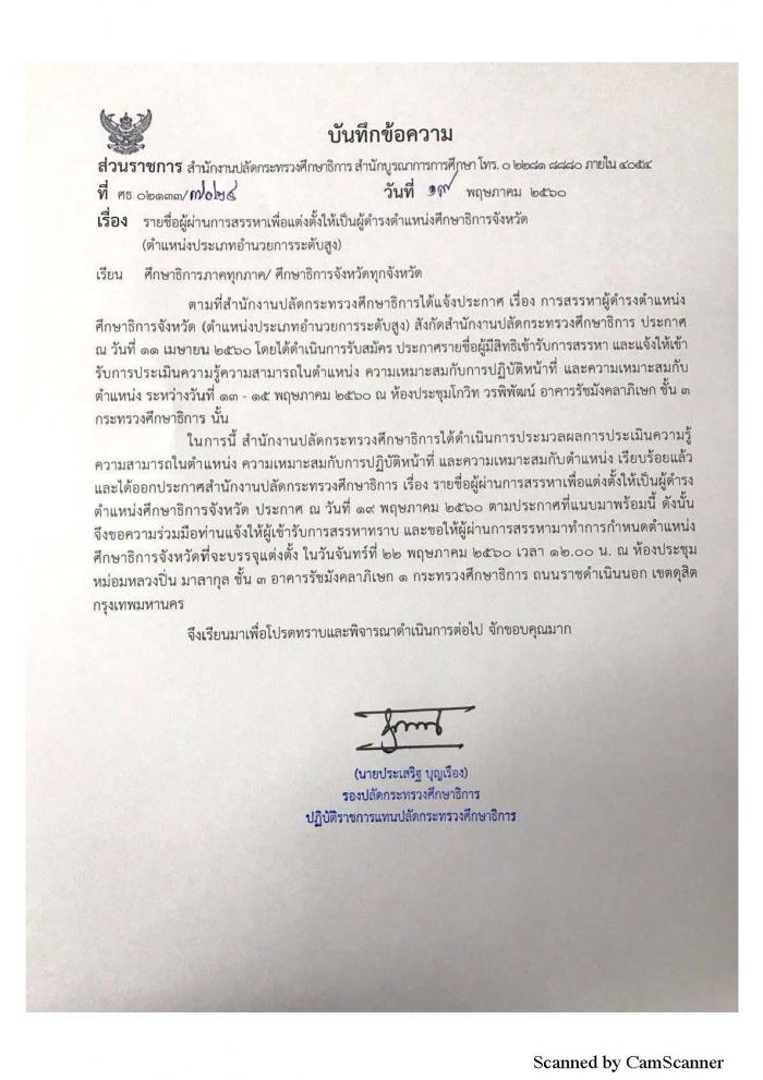 ประกาศสำนักงานปลัดกระทรวงศึกษาธิการ เรื่องรายชื่อผู้ผ่านการสรรหา เพื่อแต่งตั้งให้เป็นผู้ดำรงตำแหน่งศึกษาธิการจังหวัด (ตำแหน่งประเภทอำนวยการระดับสูง) สังกัดสำนักงานปลัดกระทรวงศึกษาธิการ