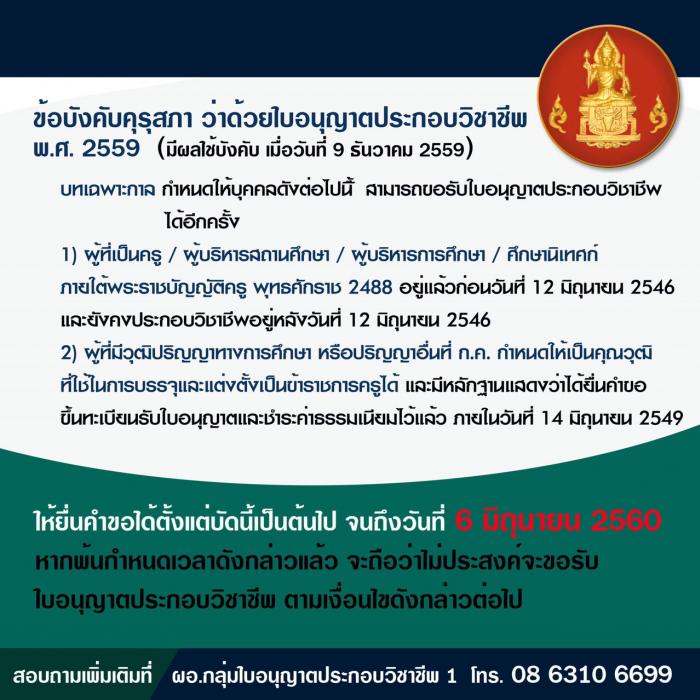 ทั้งสองกรณีดังกล่าวข้างต้น ให้ติดต่อขอขึ้นทะเบียนรับใบอนุญาตประกอบวิชาชีพ ตามแบบที่กำหนดต่อเลขาธิการคุรุสภา ภายในวันที่ 6 มิถุนายน 2560 หากพ้นกำหนดวันดังกล่าวแล้วจะถือว่า ไม่ประสงค์จะขอรับใบอนุญาตต่อไป