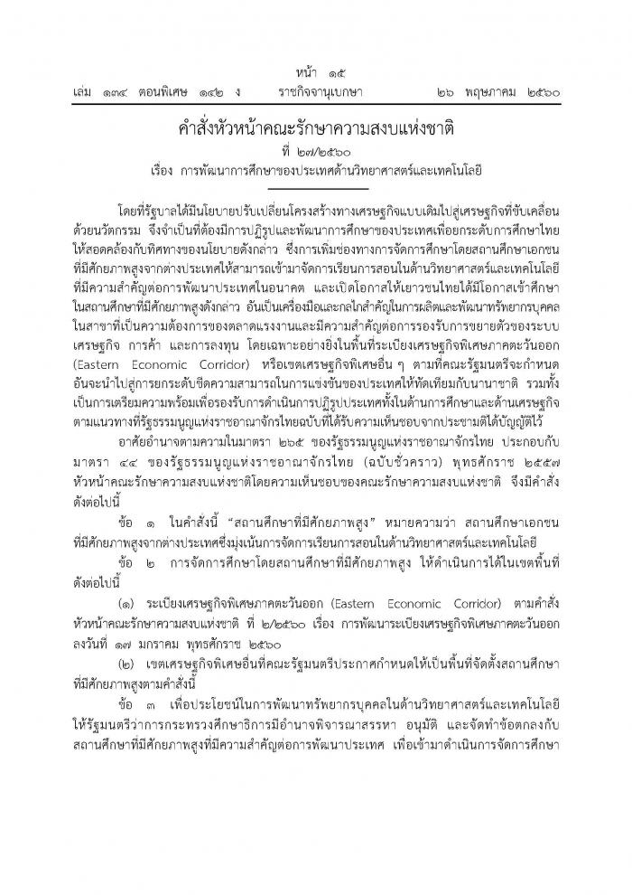 คำสั่งหัวหน้าคณะรักษาความสงบแห่งชาติ ที่ ๒๗/๒๕๖๐ เรื่อง การพัฒนาการศึกษาของประเทศด้านวิทยาศาสตร์และเทคโนโลยี