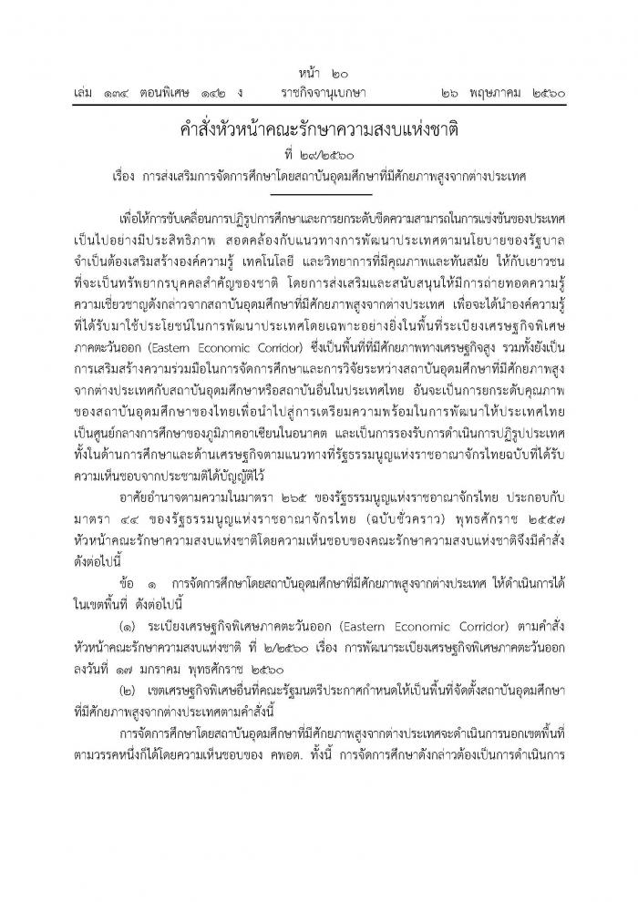 คำสั่งหัวหน้าคณะรักษาความสงบแห่งชาติ ที่ ๒๙/๒๕๖๐ เรื่อง การส่งเสริมการจัดการศึกษาโดยสถาบันอุดมศึกษาที่มีศักยภาพสูงจากต่างประเทศ