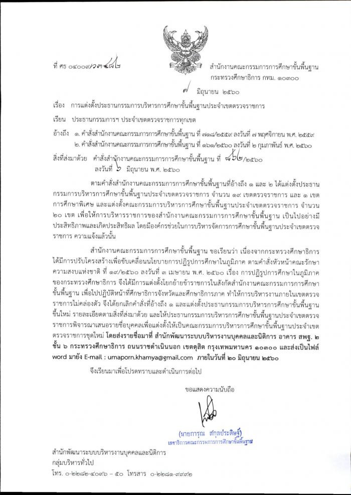 ที่ ศธ 04009/ว 3482 การแต่งตั้งประธานกรรมการบริหารการศึกษาขั้นพื้นฐานประจำเขตตรวจราชการ