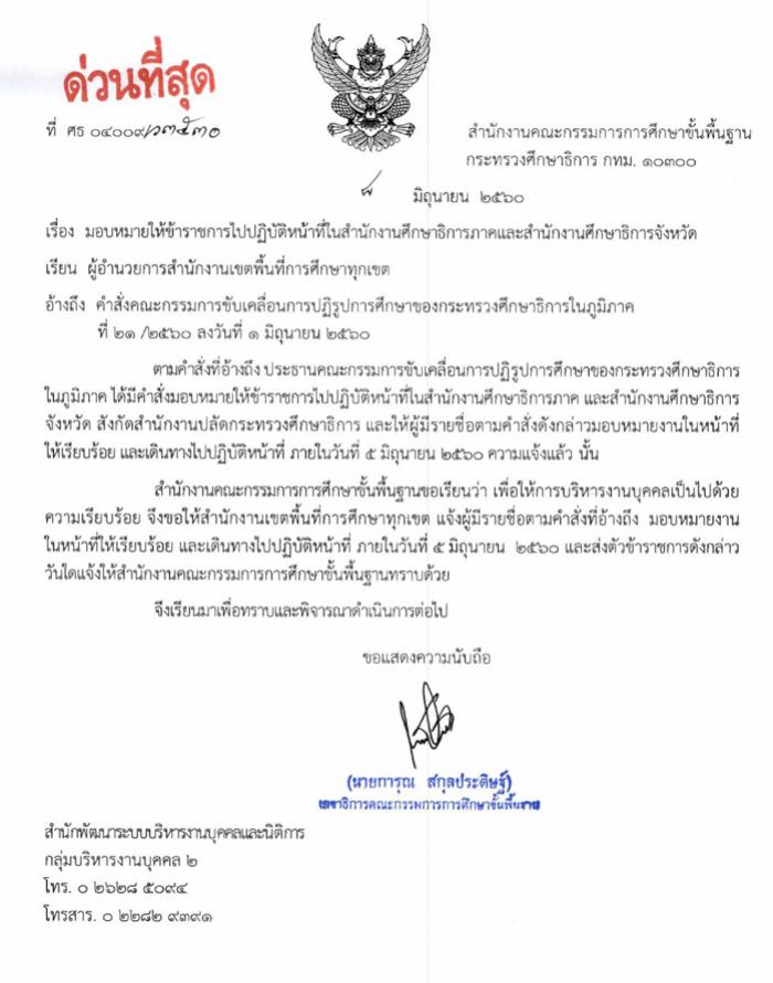 ด่วนที่สุด ที่ ศธ 04009/ว3530 มอบหมายให้ข้าราชการไปปฏิบัติหน้าที่ในสำนักงานศึกษาธิการภาคและสำนักงานศึกษาธิการจังหวัด