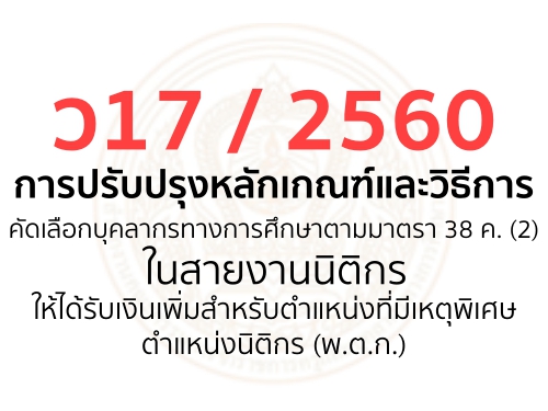 ว17/2560 เรื่อง การปรับปรุงหลักเกณฑ์และวิธีการคัดเลือกบุคลากรทางการศึกษาตามมาตรา 38 ค. (2) ในสายงานนิติกร ให้ได้รับเงินเพิ่มสำหรับตำแหน่งที่มีเหตุพิเศษ ตำแหน่งนิติกร (พ.ต.ก.)