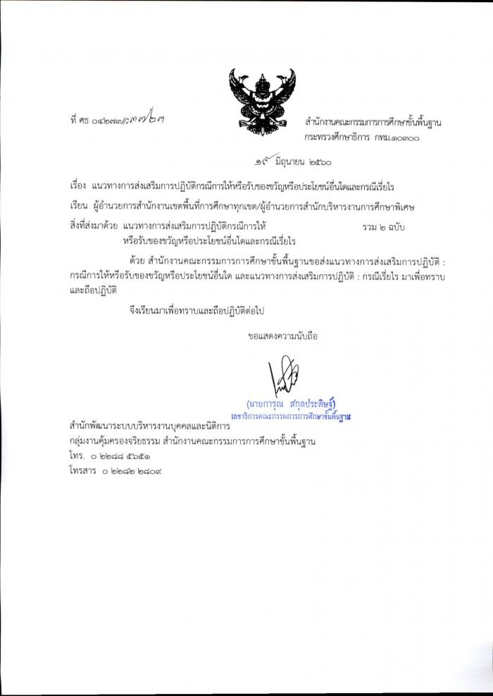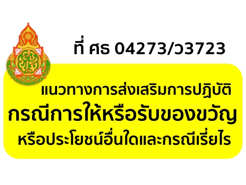 ที่ ศธ 04273/ว3723 แนวทางการส่งเสริมการปฏิบัติกรณีการให้หรือรับของขวัญหรือประโยชน์อื่นใดและกรณีเรี่ยไร