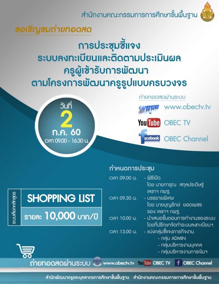 สำนักงานคณะกรรมการการศึกษาขั้นพื้นฐาน ขอเชิญชมถ่ายทอดสด การประชุมชี้แจงระบบลงทะเบียนและติดตามประเมินผลครูผู้เข้ารับการพัฒนา ตามโครงการพัฒนาครูรูปแบบครบวงจร