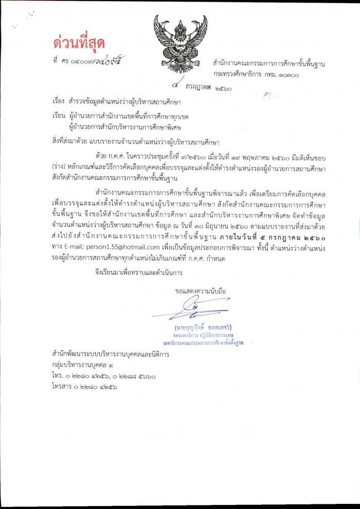 ด่วนที่สุด ที่ ศธ 04009/ว 4095 สำรวจข้อมูลตำแหน่งว่างผู้บริหารสถานศึกษา