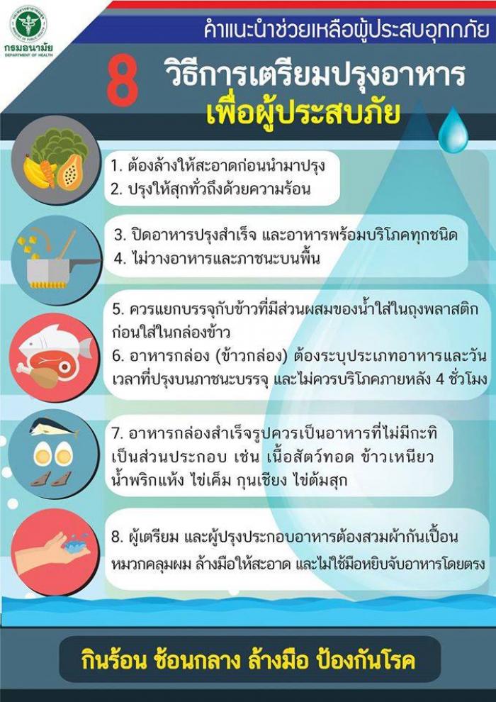 กรมอนามัย เผยแพร่สาระความรู้ ผ่านทางเพจ กรมอนามัย เพื่อให้คำแนะนำช่วยเหลือผู้ประสบอุทกภัย 8 วิธีการเตรียมปรุงอาหารเพื่อช่วยเหลือผู้ประสบภัย ในช่วงที่พี่น้องชาวไทยหลายพื้นที่ ประสบกับอุทกภัย ดังนี้