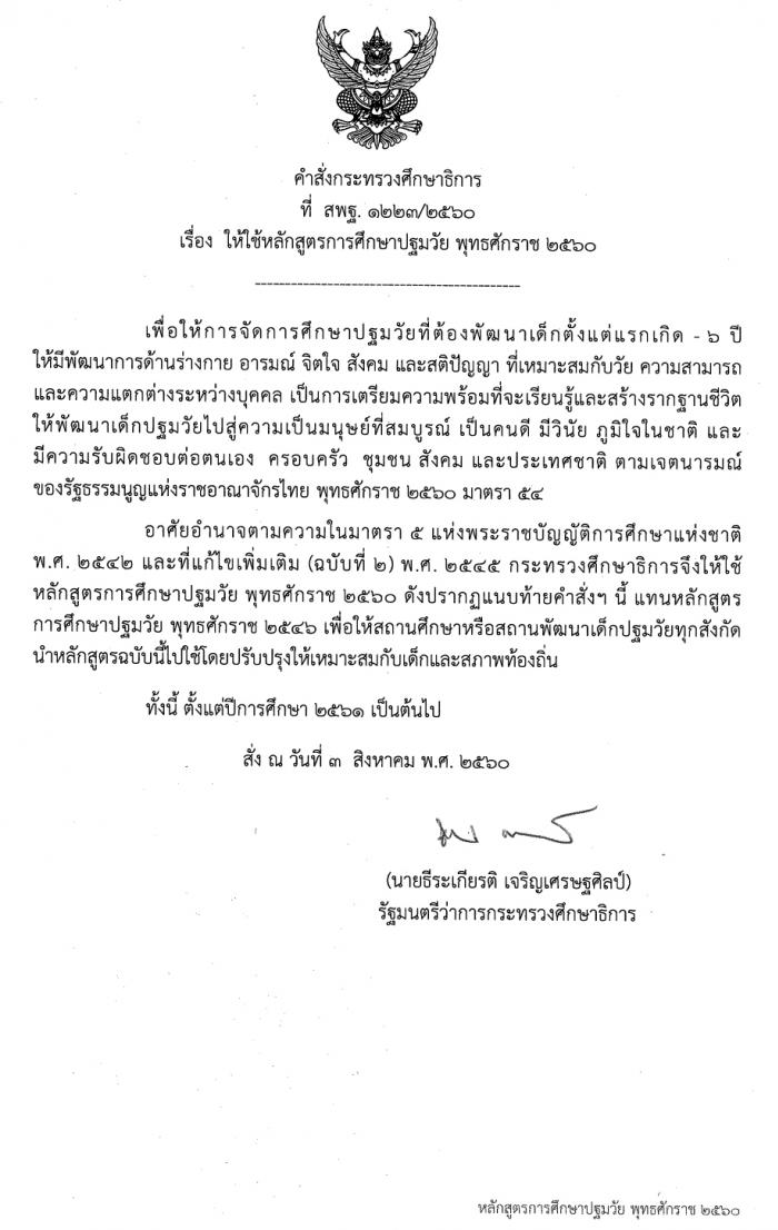 คำสั่งกระทรวงศึกษาธิการ เรื่อง ให้ใช้หลักสูตรการศึกษาปฐมวัย พุทธศักราช 2560