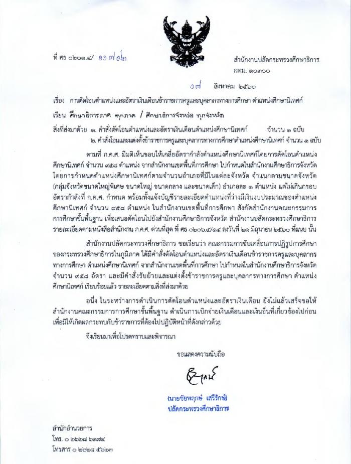 คำสั่งการตัดโอนตำแหน่งและอัตราเงินเดือนข้าราชการครูและบุคลากรทางการศึกษา ตำแหน่งศึกษานิเทศก์