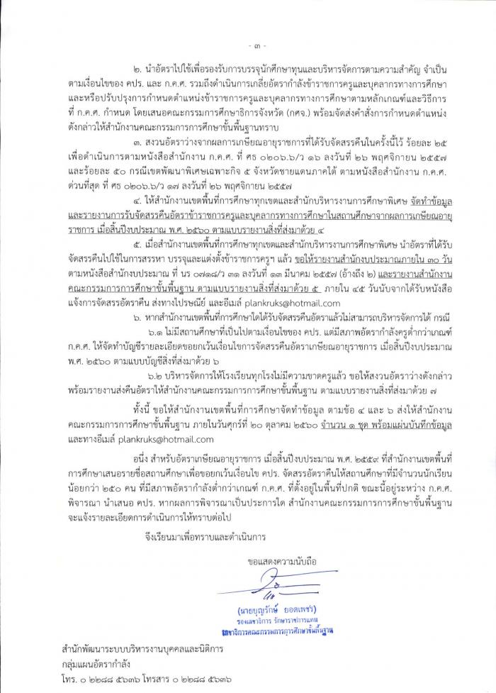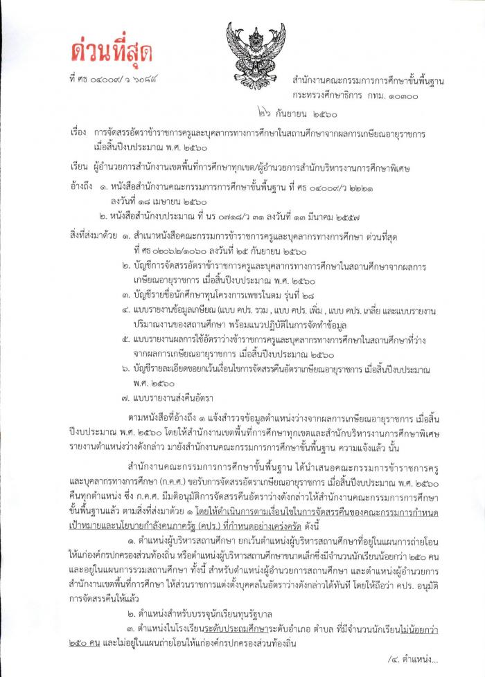 ด่วนที่สุด ที่ ศธ 04009/ว 6088 การจัดสรรอัตราข้าราชการครูและบุคลากรทางการศึกษาในสถานศึกษาจากผลการเกษียณอายุราชการ เมื่อสิ้นปีงบประมาณ พ.ศ.2560