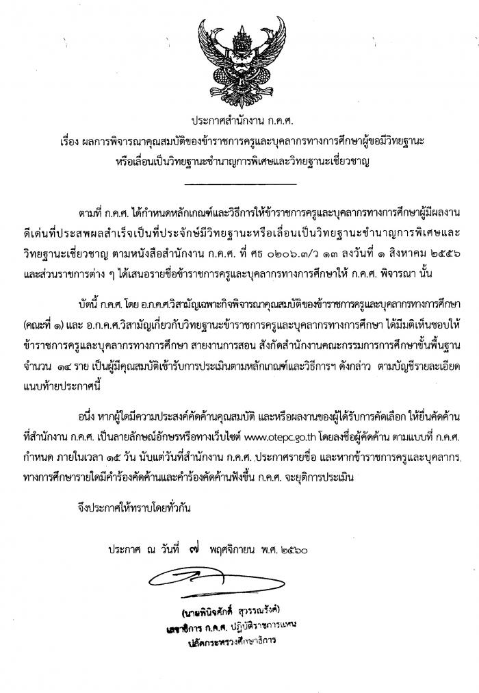 ประกาศสำนักงาน ก.ค.ศ. เรื่อง ผลการพิจารณาคุณสมบัติของข้าราชการครูและบุคลากรทางการศึกษา ผู้ขอมีวิทยฐานะหรือเลื่อนเป็นวิทยฐานะขำนาญการพิเศษและวิทยฐานะเชี่ยวชาญ ประกาศ ณ วันที่ 7 พฤศจิกายน พ.ศ. 2560 (จำนวน 14 ราย)