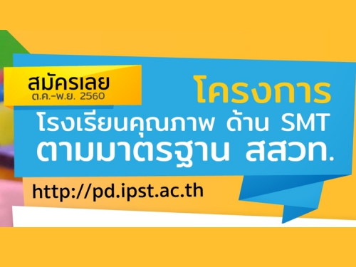 สสวท. เปิดรับสมัครโรงเรียนประถมศึกษา และโรงเรียนมัธยมศึกษา เข้าร่วมโครงการ "โรงเรียนคุณภาพด้านวิทยาศาสตร์ คณิตศาสตร์ และ เทคโนโลยี (SMT) ตามมาตรฐานสถาบันส่งเสริมการสอนวิทยาศาสตร์ และเทคโนโลยี (สสวท.)" ตั้งแต่บัดนี้จนถึงวันที่ 30 พฤศจิกายน 2560 โดยผู้สนใจดูรายละเอียดและสมัครได้ที่เว็บไซต์ http://pd.ipst.ac.th สอบถามข้อมูลที่ฝ่ายบริหารเครือข่ายและพัฒนาวิชาชีพครู โทร. 0 2392 4021 ต่อ 3202 หรือ 3203
