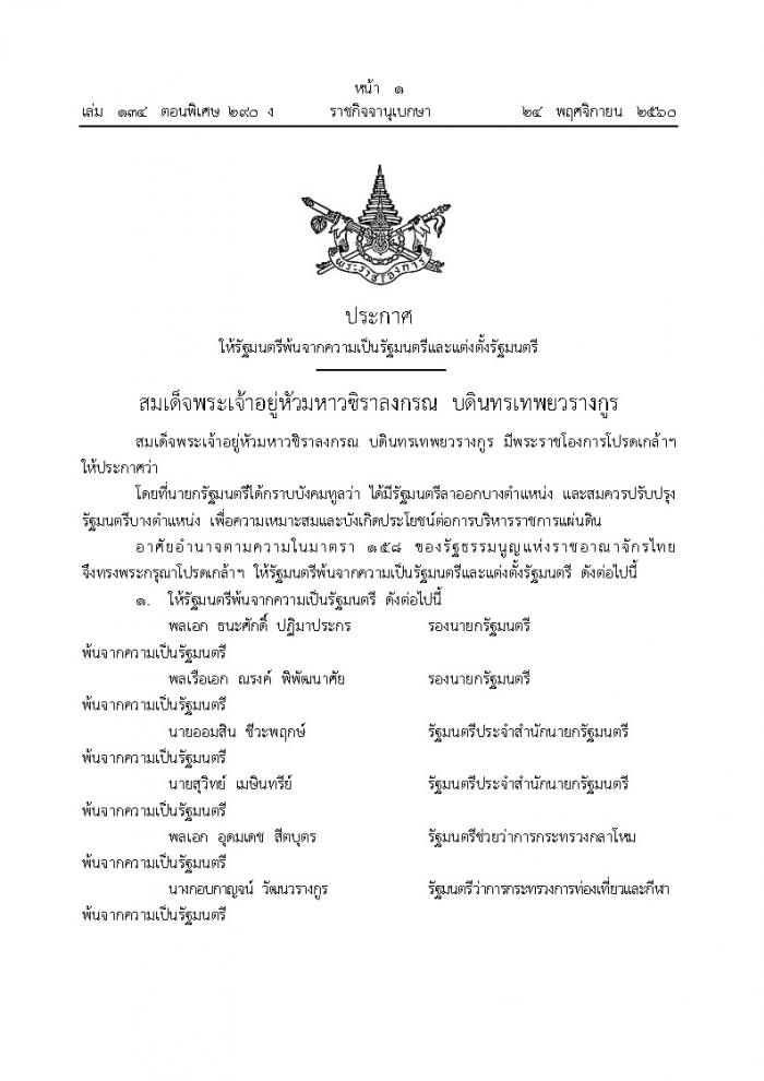 เมื่อวันที่ 24 พฤศจิกายน 2560 เว็บไซต์ราชกิจจานุเบกษา เผยแพร่ ประกาศให้รัฐมนตรีพ้นจากความเป็นรัฐมนตรีและแต่งตั้งรัฐมนตรี ดังนี้