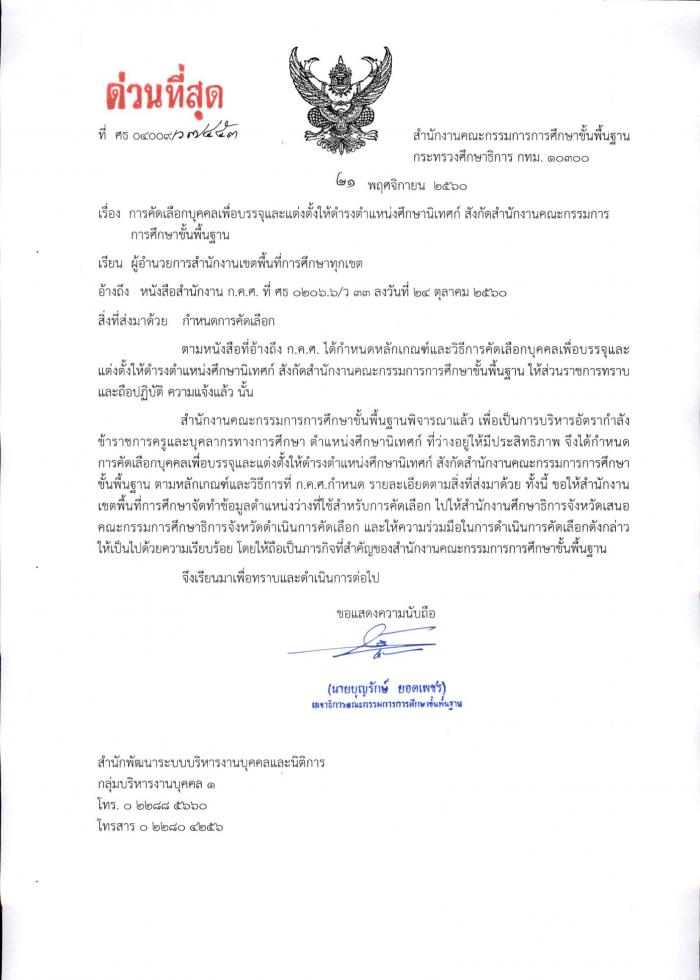 ด่วนที่สุด ที่ ศธ 04009/ว 7453 การคัดเลือกบุคคลเพื่อบรรจุและแต่งตั้งให้ดำรงตำแหน่งศึกษานิเทศก์ สังกัด สพฐ.