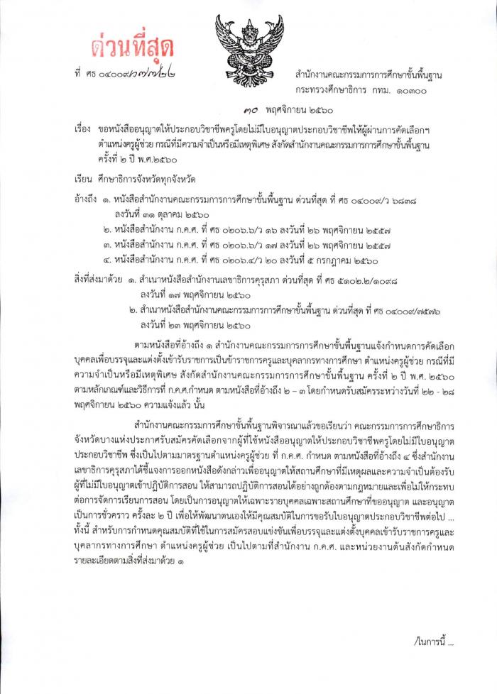 ด่วนที่สุด ที่ ศธ 04009/ว772 ขอหนังสืออนุญาตให้ประกอบวิชาชีพครูโดยไม่มีใบอนุญาตประกอบวิชาชีพให้ผู้ผ่านการคัดเลือกฯ ตำแหน่งครูผู้ช่วย กรณีที่มีความจำเป็นหรือเหตุพิเศษ สังกัด สพฐ.ครั้งที่ 2 ปี พ.ศ.2560 (กศจ.)