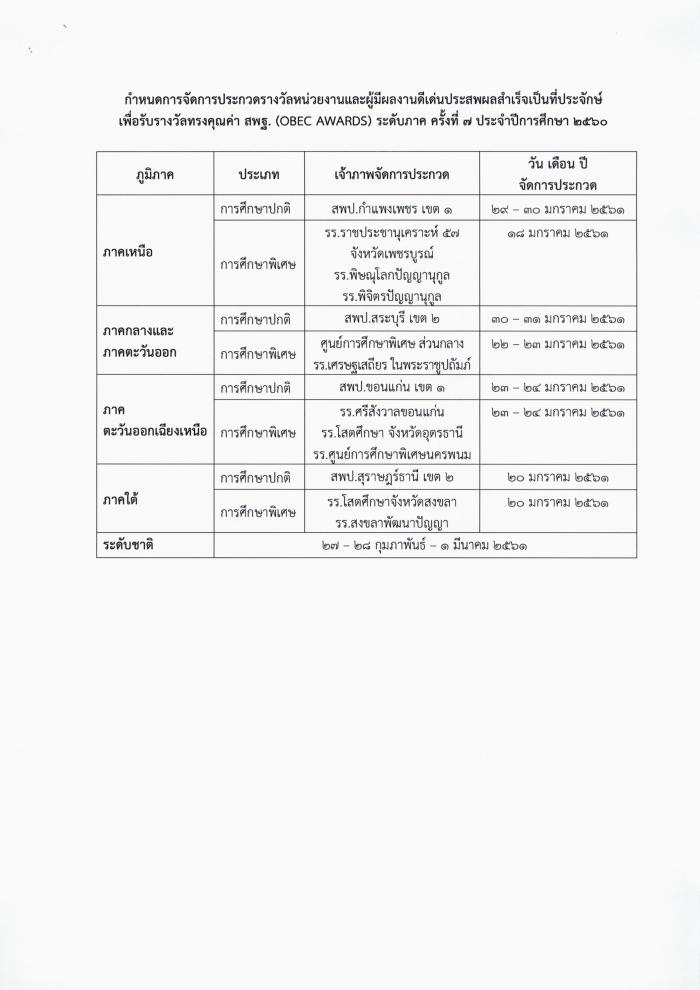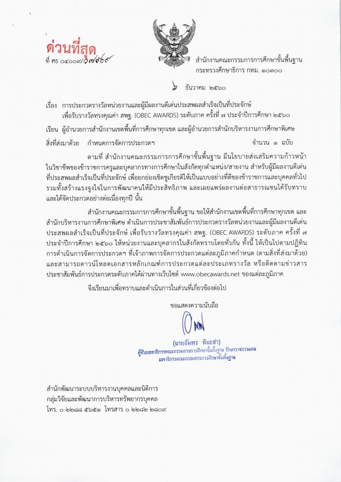 ด่วนที่สุด ที่ ศธ 04009/ว 7909 การประกวดรางวัลหน่วยงานและผู้มีผลงานดีเด่นประสพผลสำเร็จเป็นที่ประจักษ์ เพื่อรับรางวัลทรงคุณค่า สพฐ. (OBEC AWARDS) ระดับภาค ครั้งที่ 7 ประจำปีการศึกษา 2560