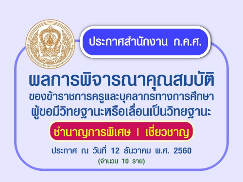 ประกาศสำนักงาน ก.ค.ศ. เรื่อง ผลการพิจารณาคุณสมบัติของข้าราชการครูและบุคลากรทางการศึกษา ผู้ขอมีวิทยฐานะหรือเลื่อนเป็นวิทยฐานะชำนาญการพิเศษและวิทยฐานะเชี่ยวชาญ ประกาศ ณ วันที่ 12 ธันวาคม พ.ศ. 2560 (จำนวน 10 ราย)