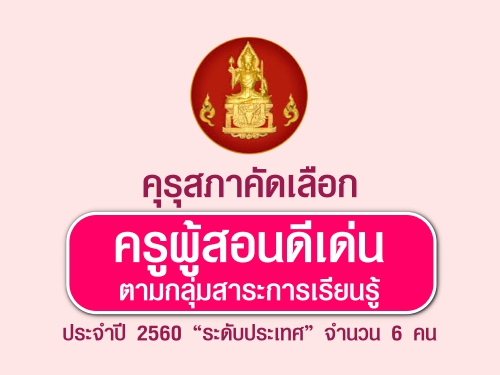 ดูรายละเอียดประกาศคัดเลือกครูผู้สอนดีเด่นตามกลุ่มสาระการเรียนรู้ ประจำปี 2560 ได้ที่เว็บไซต์คุรุสภา