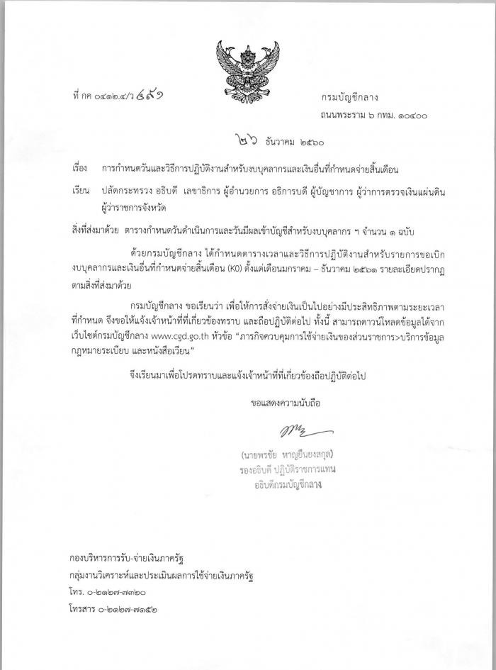 เมื่อวันที่ 26 ธันวาคม 2560 เว็บไซต์กรมบัญชีกลาง ได้เผยแพร่การกำหนดวันและวิธีการปฏิบัติงานสำหรับงบบุคลากรและเงินอื่นที่กำหนดจ่ายสิ้นเดือน (ว 491) ซึ่งมีรายละเอียดเกี่ยวกับการกำหนดวันที่โอนเงินเดือนเข้าบัญชีธนาคารของข้าราชการ ในแต่ละเดือน ประจำปี 2561 โดยมีรายละเอียด ดังนี้