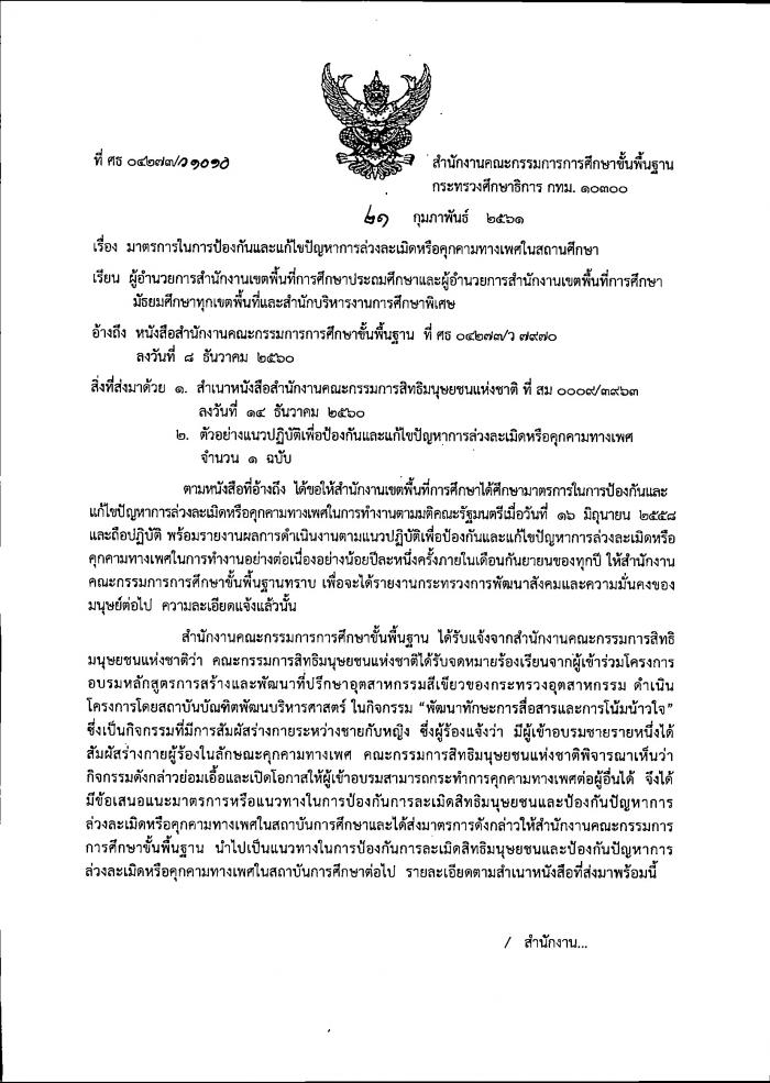 ที่ ศธ 04009/ว1010 มาตรการในการป้องกันและแก้ไขปัญหาการล่วงละเมิดหรือคุกคามทางเพศในสถานศึกษา