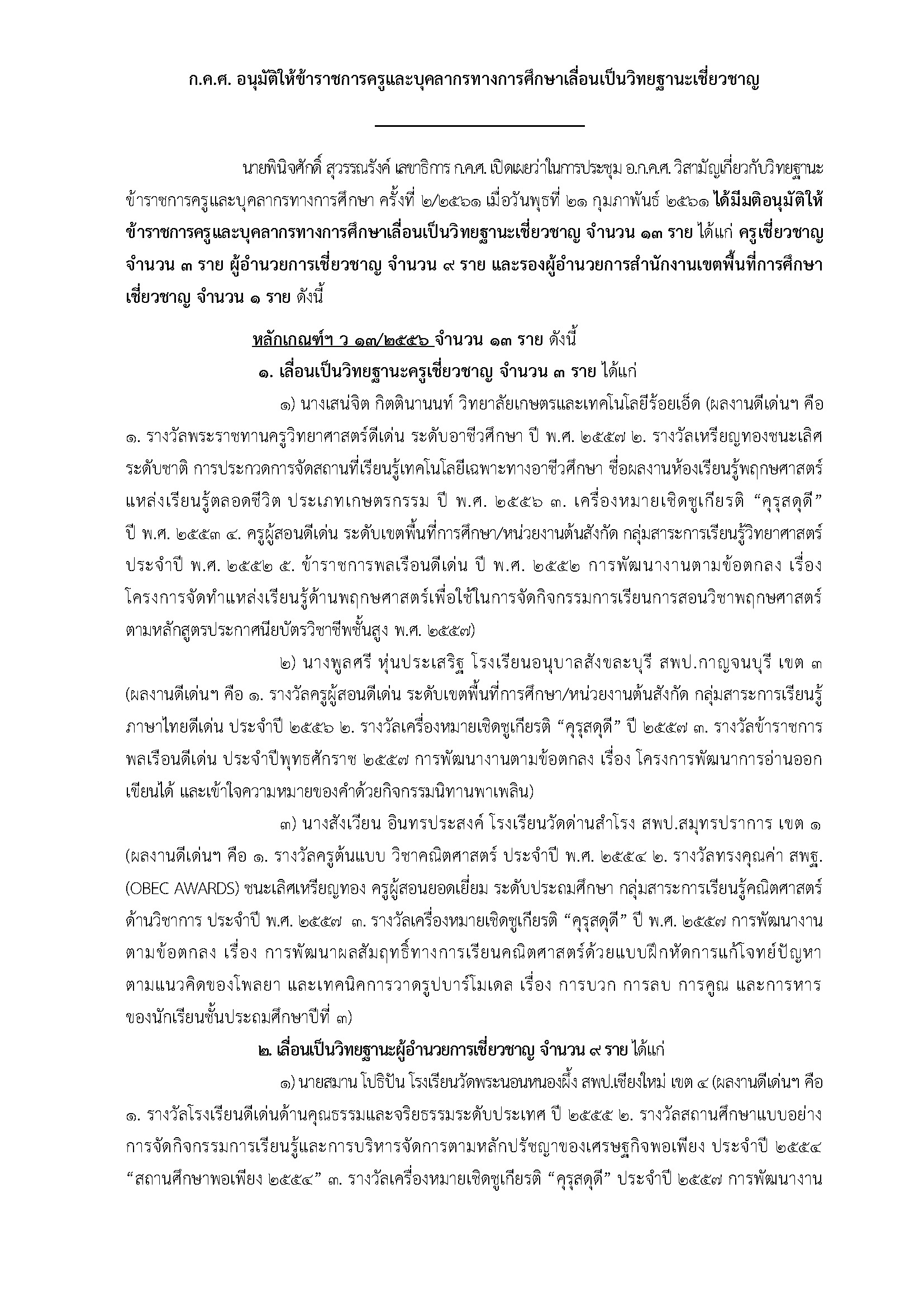 นายพินิจศักดิ์ สุวรรณรังค์ เลขาธิการ ก.ค.ศ. เปิดเผยว่าในการประชุม อ.ก.ค.ศ. วิสามัญเกี่ยวกับวิทยฐานะข้าราชการครูและบุคลากรทางการศึกษา ครั้งที่ ๒/๒๕๖๑ เมื่อวันพุธที่ ๒๑ กุมภาพันธ์ ๒๕๖๑ ได้มีมติอนุมัติให้ข้าราชการครูและบุคลากรทางการศึกษาเลื่อนเป็นวิทยฐานะเชี่ยวชาญ จำนวน ๑๓ ราย ได้แก่ ครูเชี่ยวชาญ จำนวน ๓ ราย ผู้อำนวยการเชี่ยวชาญ จำนวน ๙ ราย และรองผู้อำนวยการสำนักงานเขตพื้นที่การศึกษาเชี่ยวชาญ จำนวน ๑ ราย