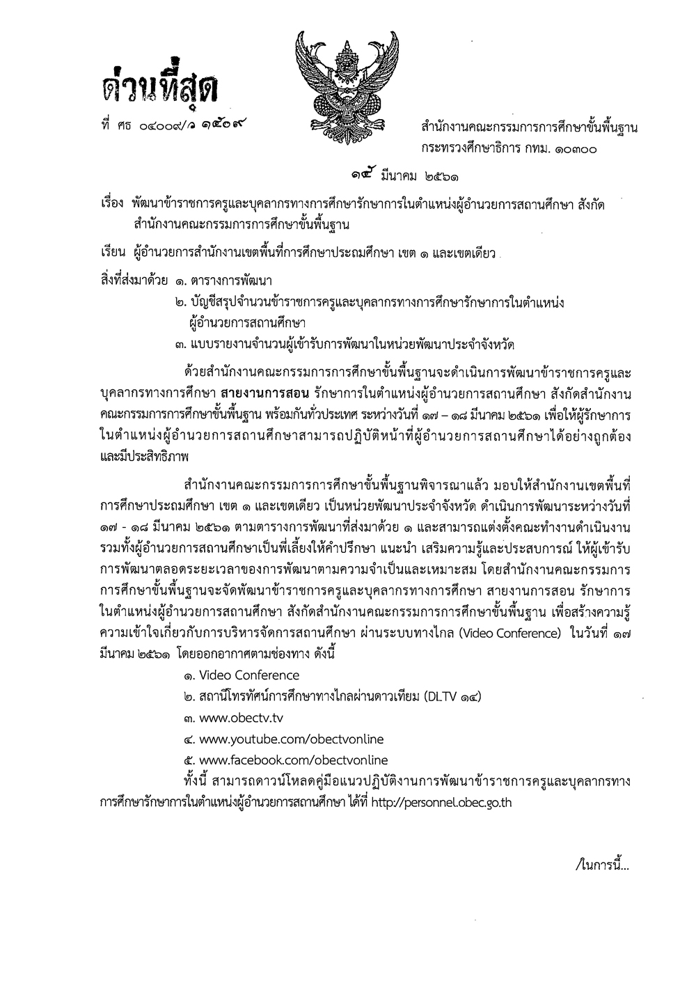 ด่วนที่สุด ที่ ศธ 04009/ว 1509 ลงวันที่ 15 มีนาคม 2561 เรื่อง พัฒนาข้าราชการครูและบุคลากรทางการศึกษารักษาการในตำแหน่งผู้อำนวยการสถานศึกษา สังกัด สพฐ.