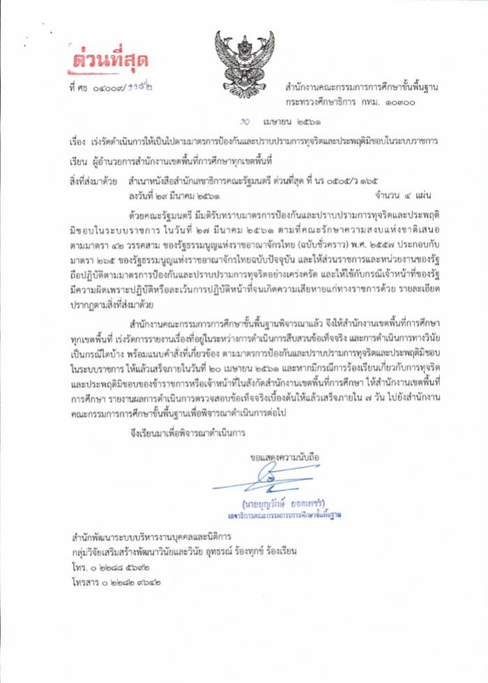 ด่วนที่สุด ที่ ศธ 04009/1192 เร่งรัดดำเนินการให้เป็นไปตามมาตรการป้องกันและปราบปรามการทุจริตและประพฤติมิชอบในระบบราชการ