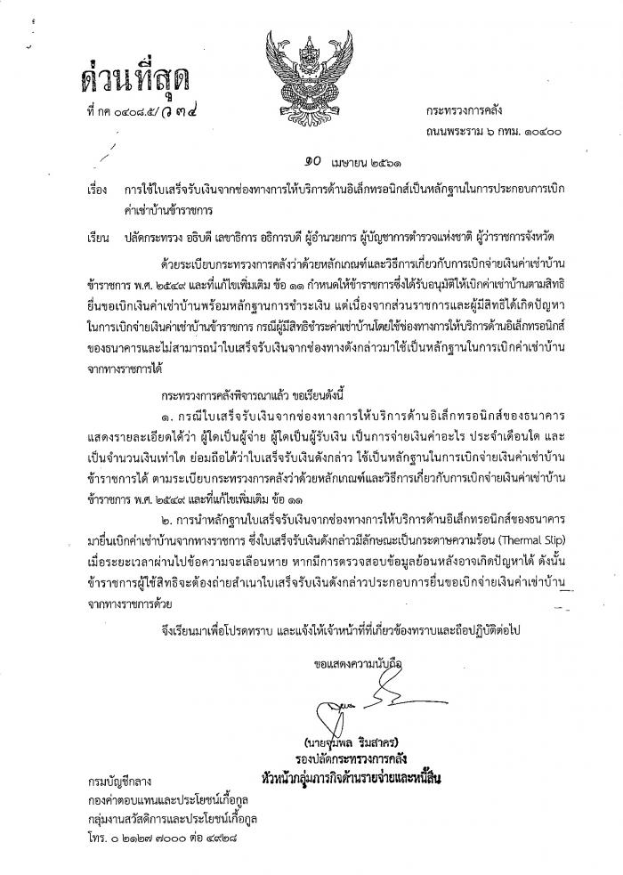 การใช้ใบเสร็จรับเงินจากช่องทางการให้บริการด้านอิเล็กทรอนิกส์เป็นหลักฐานในการประกอบการเบิกค่าเช่าบ้านข้าราชการ (ว 34)