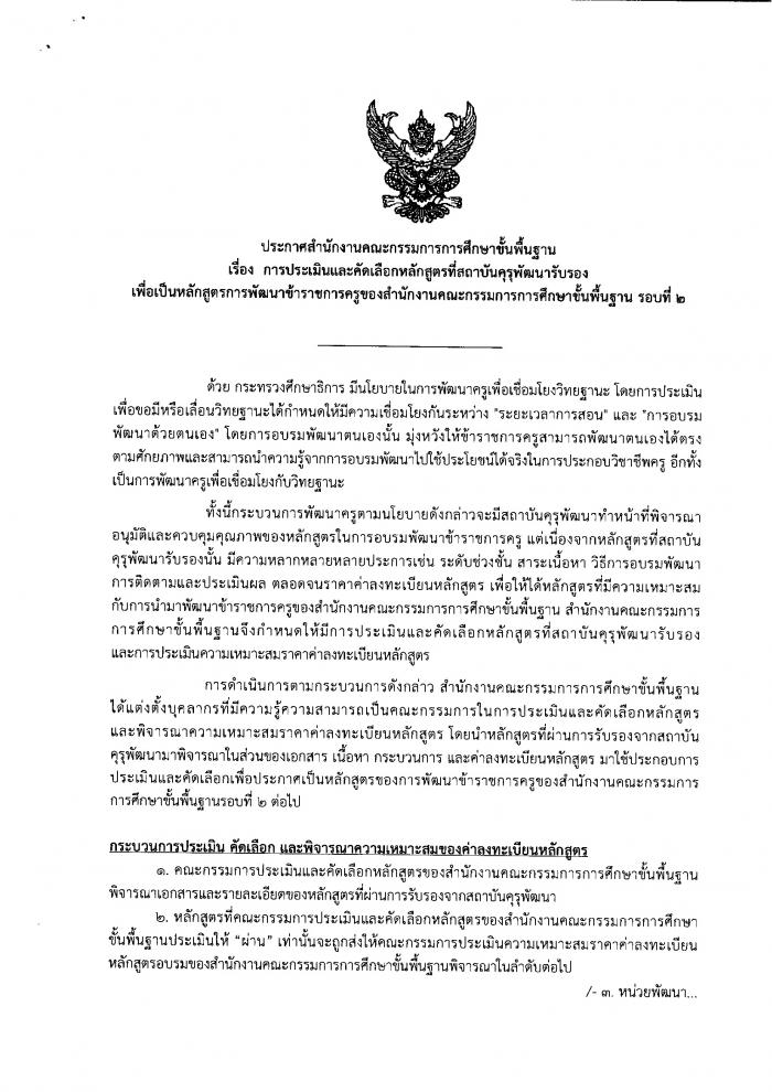 ประกาศการประเมินและคัดเลือกหลักสูตรที่สถาบันคุรุพัฒนารับรอง เพื่อเป็นหลักสูตรการพัฒนาข้าราชการครูของสำนักงานคณะกรรมการการศึกษาขั้นพื้นฐาน รอบที่ 2
