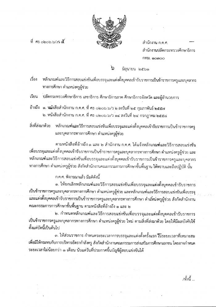 ว5/2561 หลักเกณฑ์และวิธีการสอบแข่งขันเพื่อบรรจุและแต่งตั้งบุคคลเข้ารับราชการเป็นข้าราชการครูและบุคลากรทางการศึกษา ตำแหน่งครูผู้ช่วย
