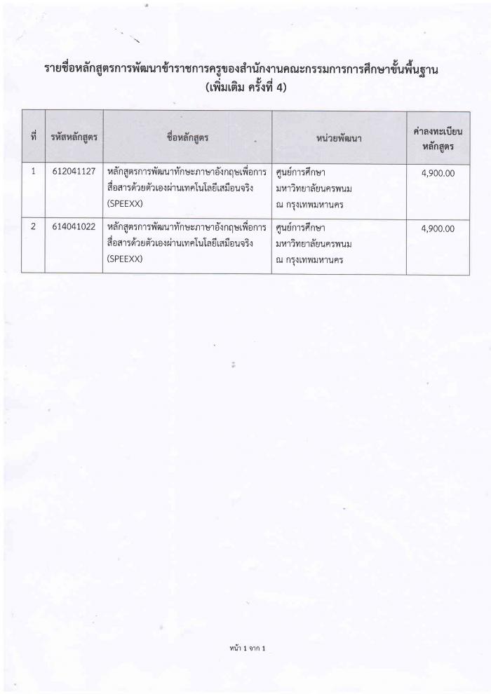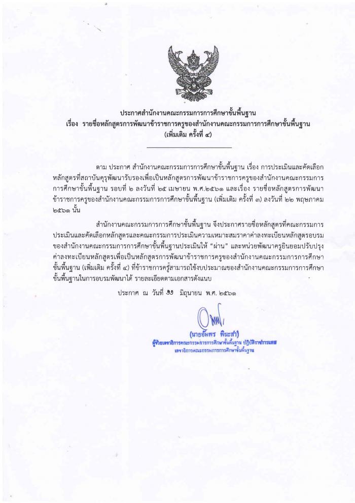 ประกาศ เรื่อง รายชื่อหลักสูตรการพัฒนาข้าราชการครู ของสำนักงานคณะกรรมการการศึกษาขั้นพื้นฐาน (เพิ่มเติม ครั้งที่ 4)