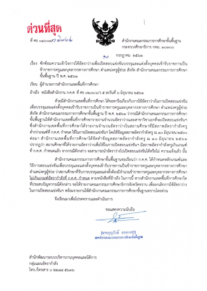 ด่วนที่สุด ที่ ศธ 04009/ว พิเศษ 2 เรื่อง ซักซ้อมความเข้าใจการใช้อัตราว่างเพื่อเปิดสอบแข่งขันบรรจุและแต่งตั้งบุคคลเข้ารับราชการเป็นข้าราชการครูและบุคลากรทางการศึกษา ตำแหน่งครูผู้ช่วย สังกัด สพฐ. ปี พ.ศ.2561