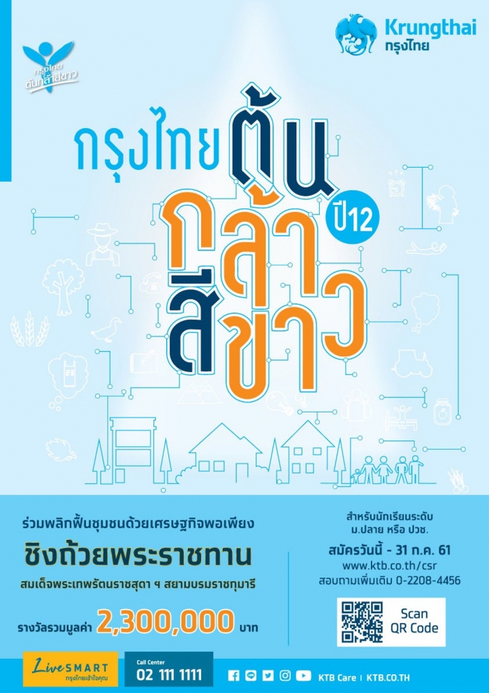 ธนาคารกรุงไทย ร่วมสนับสนุนเยาวชนให้เป็นคนเก่ง คนดี มีความรู้คู่คุณธรรม และรู้จักนำแนวคิดเศรษฐกิจพอเพียงไปเป็นหลักในการดำเนินชีวิต ผ่านโครงการ “กรุงไทย ต้นกล้าสีขาว” ปีที่ 12 โดยเชิญชวนนักเรียนมัธยมศึกษาตอนปลาย และปวช. ทั่วประเทศ ส่งโครงงานการดำเนินธุรกิจ พลิกฟื้นชุมชน ด้วยเศรษฐกิจพอเพียง สู่ความยั่งยืน เข้าประกวด ชิงถ้วยพระราชทานสมเด็จพระเทพรัตนราชสุดาฯ สยามบรมราชกุมารี พร้อมทุนการศึกษารวม 2,300,000 บาท นอกจากนี้ นักเรียนที่ผ่านเข้ารอบ 15 ทีมยังได้ทำกิจกรรมที่เป็นประโยชน์ ได้เรียนรู้ ฝึกการทำงานเป็นทีม ทำงานอย่างเป็นระบบ นำเสนอผลงานอย่างมืออาชีพ และได้พบเพื่อนใหม่ ขณะเดียวกัน ครูและโรงเรียนยังสามารถประยุกต์การดำเนินโครงงานของนักเรียน เพื่อตอบโจทย์นโยบายลดเวลาเรียน เพิ่มเวลารู้ เปิดรับสมัครถึง 31 กรกฎาคม 2561 ดูข้อมูลเพิ่มเติมและสมัครได้ที่ www.ktb.co.th/csr หรือโทรสอบถามที่ 0 2208 4456