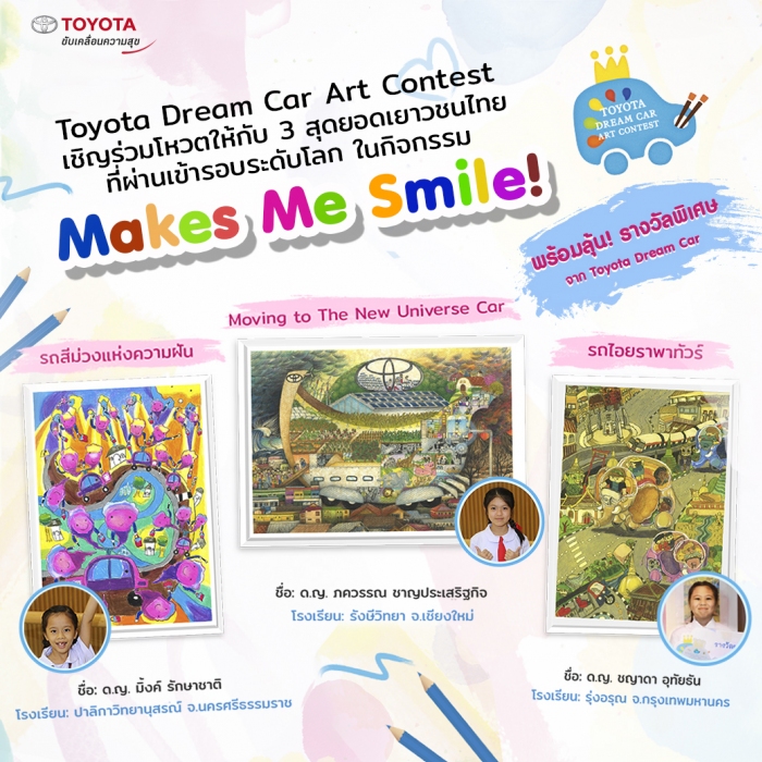 นอกจากนี้โครงการ Toyota Dream Art Contest 2018 ประเทศญี่ปุ่น ยังจัดกิจกรรม Makes Me Smile! ที่เปิดโอกาสให้ทุกคนทั่วโลก ได้เข้าร่วมโหวตผ่านเว็บไซต์โดยผลงานศิลปินไทยตัวน้อยทั้ง 3 คน ได้อยู่ในกิจกรรมนี้ด้วยเช่นเดียวกัน ดังนั้นบริษัท โตโยต้า มอเตอร์ ประเทศไทย จำกัด จึงขอเชิญชวน ให้ทุกท่าน ร่วมสนับสนุนผลงานเยาวชนไทยภาพผลงานของน้องๆ ที่ได้จำนวนการโหวตสูงสุด จะได้รับรางวัลพิเศษ “