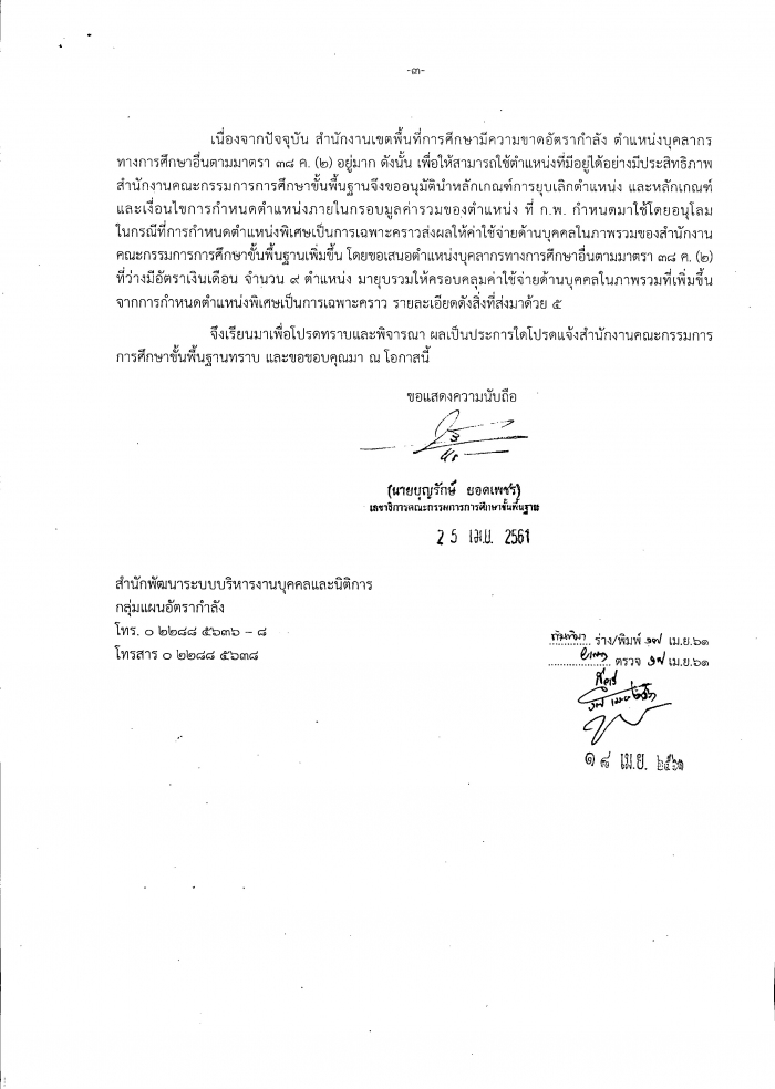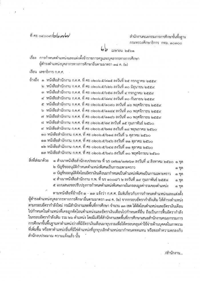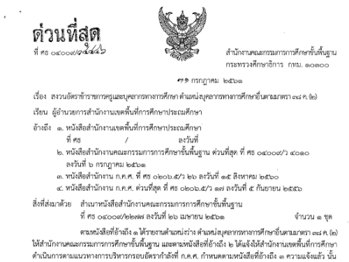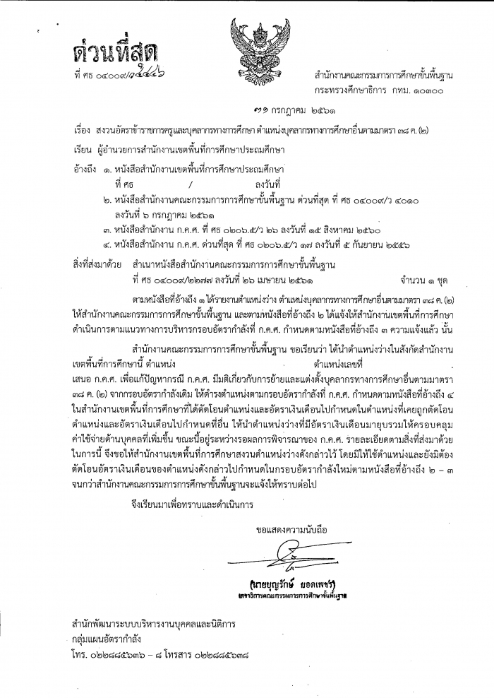 ด่วนที่สุด ที่ ศธ 04009/ ว 4446 เรื่อง สงวนอัตราข้าราชการครูและบุคลากรทางการศึกษา ตำแหน่งบุคลากรทางการศึกษาอื่นตามมาตรา 38ค (2)