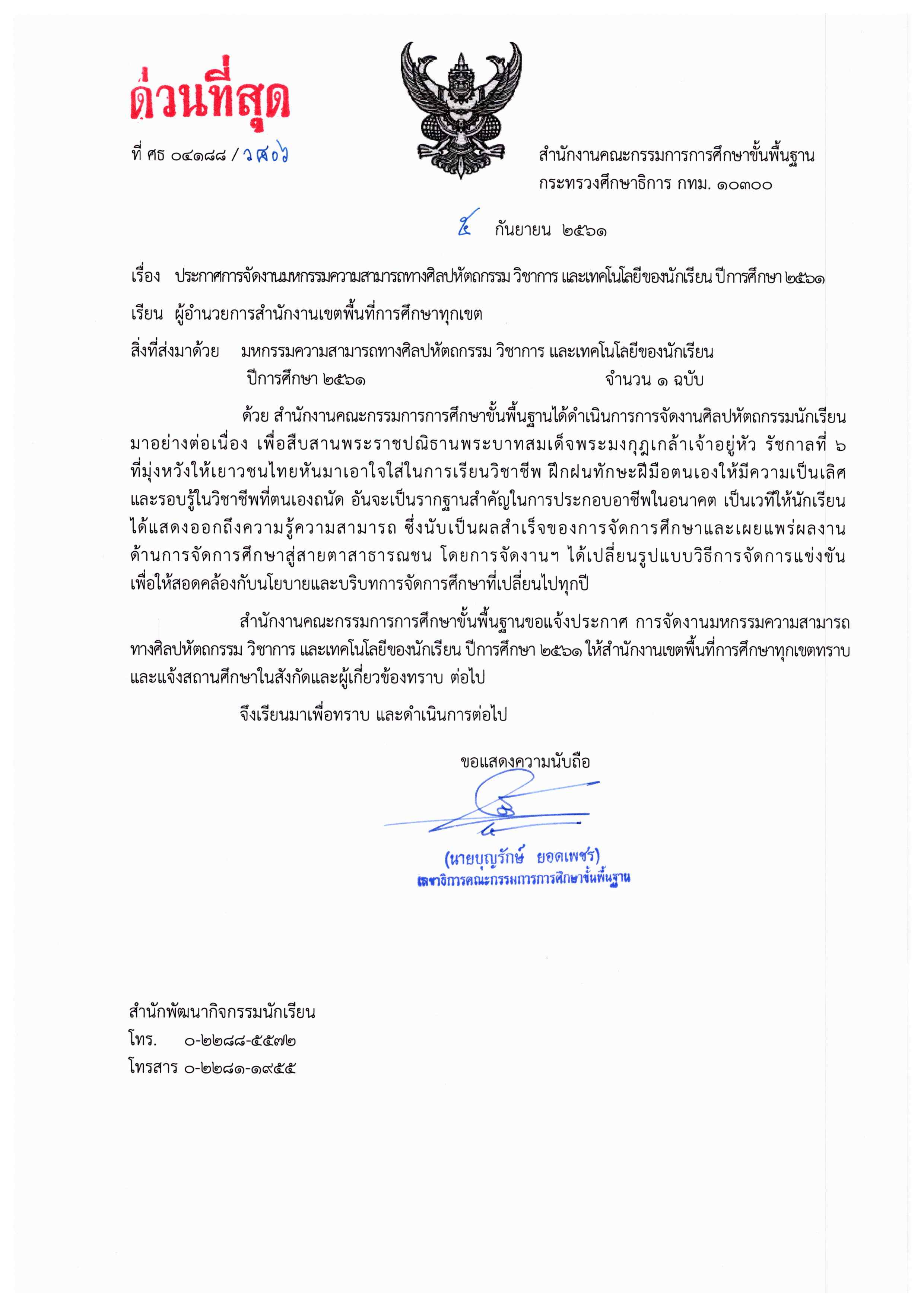 ประกาศ การจัดงานมหกรรมความสามารถทางศิลปหัตถกรรม วิชาการ และเทคโนโลยีของนักเรียน ปีการศึกษา 2561
