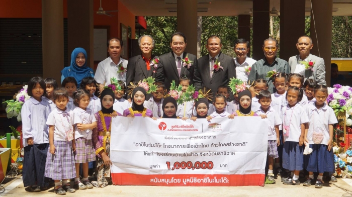 นายสุพจน์ มณีรัตนโชติ รอง ผอ.สพป.นราธิวาส เขต 2 รักษาราชการแทน ผอ.สพป.นราธิวาส เขต 2 น.ส.นูรฮัสนียา นิกาเร็ง ผู้อำนวยการโรงเรียนบ้านไม้ฝาด โดยมีนายสุรเดช เธียไพรัตน์ กรรมการและรองเลขาธิการมูลนิธิอายิโนะโมะโต๊ะ เป็นประธานส่งมอบอาคารโรงอาหารอายิโนะโมะโต๊ะ หลังที่ 90 ภายใต้ โครงการ "อายิโนะโมะโต๊ะ โภชนาการเพื่อเด็กไทย ก้าวไกลสร้างชาติ" ณ โรงเรียนโรงเรียนบ้านไม้ฝาด อ.แว้ง จ.นราธิวาส ด้วยงบประมาณการก่อสร้างจากมูลนิธิฯ จำนวนเงิน 1,000,000 บาท เพื่อก่อสร้างโรงอาหารที่ถูกสุขลักษณะให้โรงเรียนได้ใช้ประโยชน์ได้อย่างเต็มที่