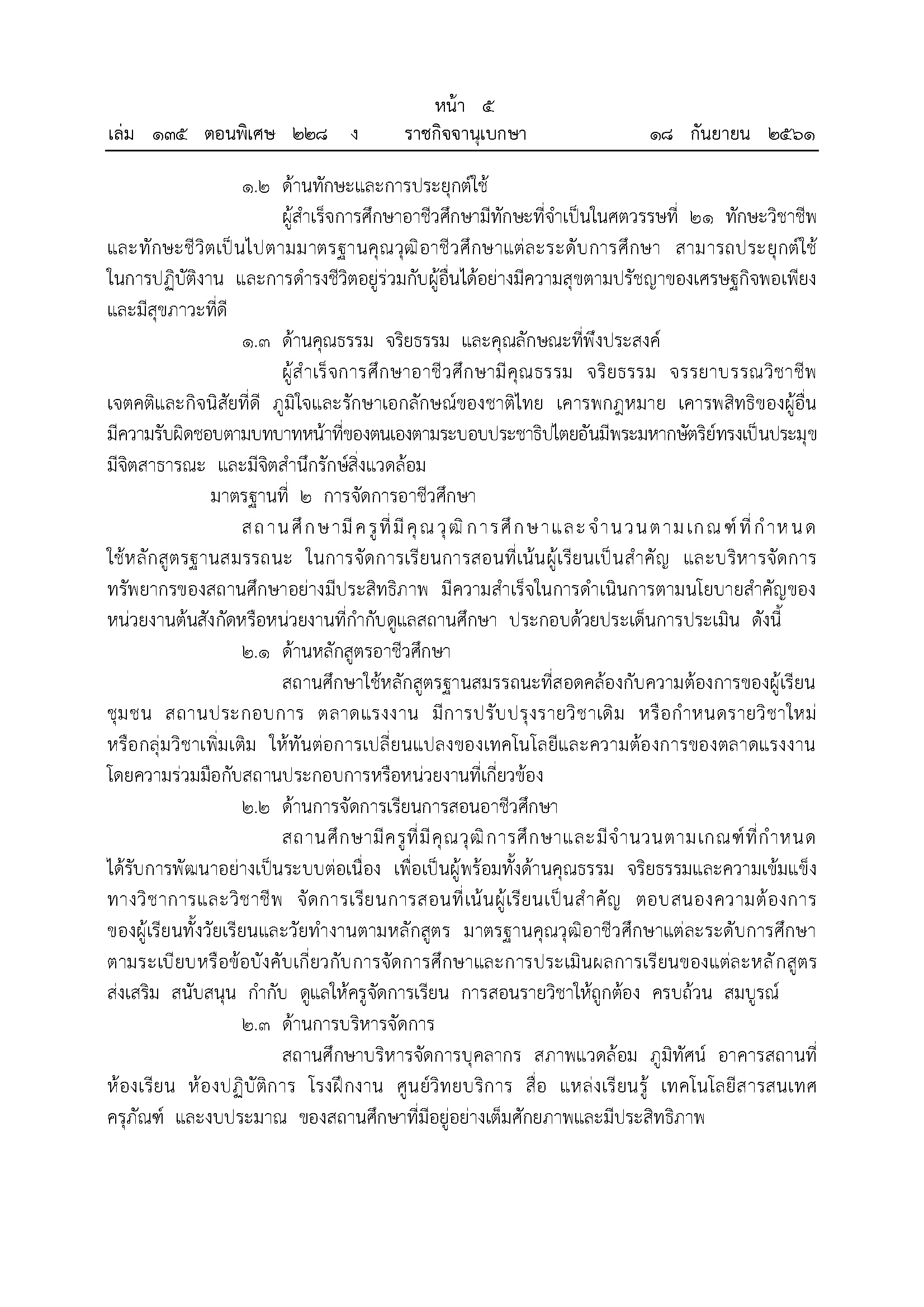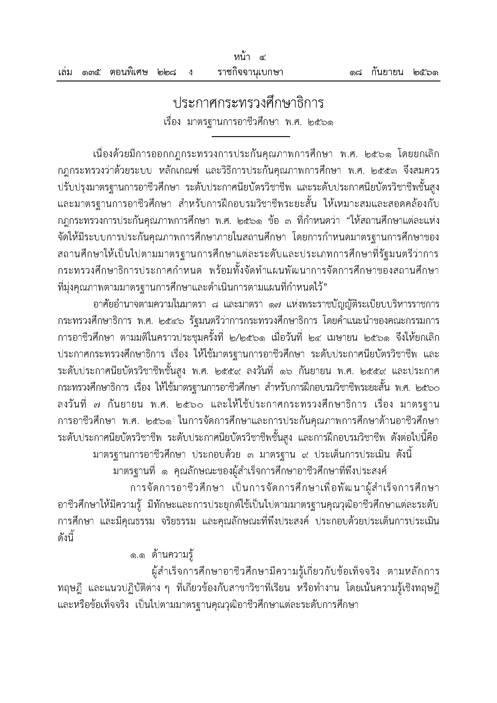 ประกาศกระทรวงศึกษาธิการ เรื่อง มาตรฐานการอาชีวศึกษา พ.ศ. ๒๕๖๑