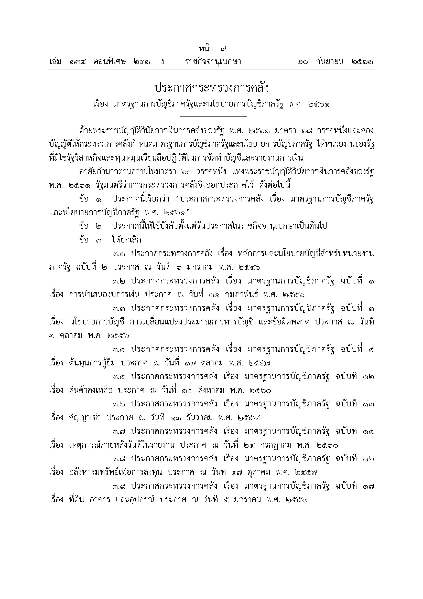 เมื่อวันที่ 20 กันยายน 2561 เว็บไซต์ราชกิจจานุเบกษา ได้เผยแพร่ ประกาศกระทรวงการคลัง เรื่อง มาตรฐานการบัญชีภาครัฐและนโยบายการบัญชีภาครัฐ พ.ศ. ๒๕๖๑