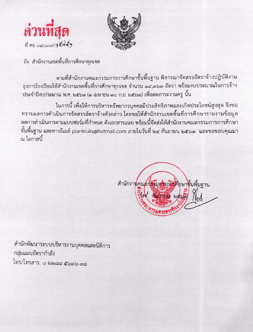 รายงานผลการดำเนินการจัดสรรอัตราจ้างปฏิบัติงานธุรการโรงเรียน (โครงการคืนครูให้นักเรียน)