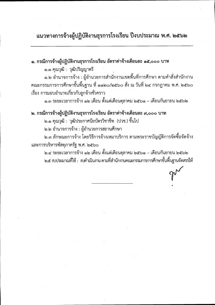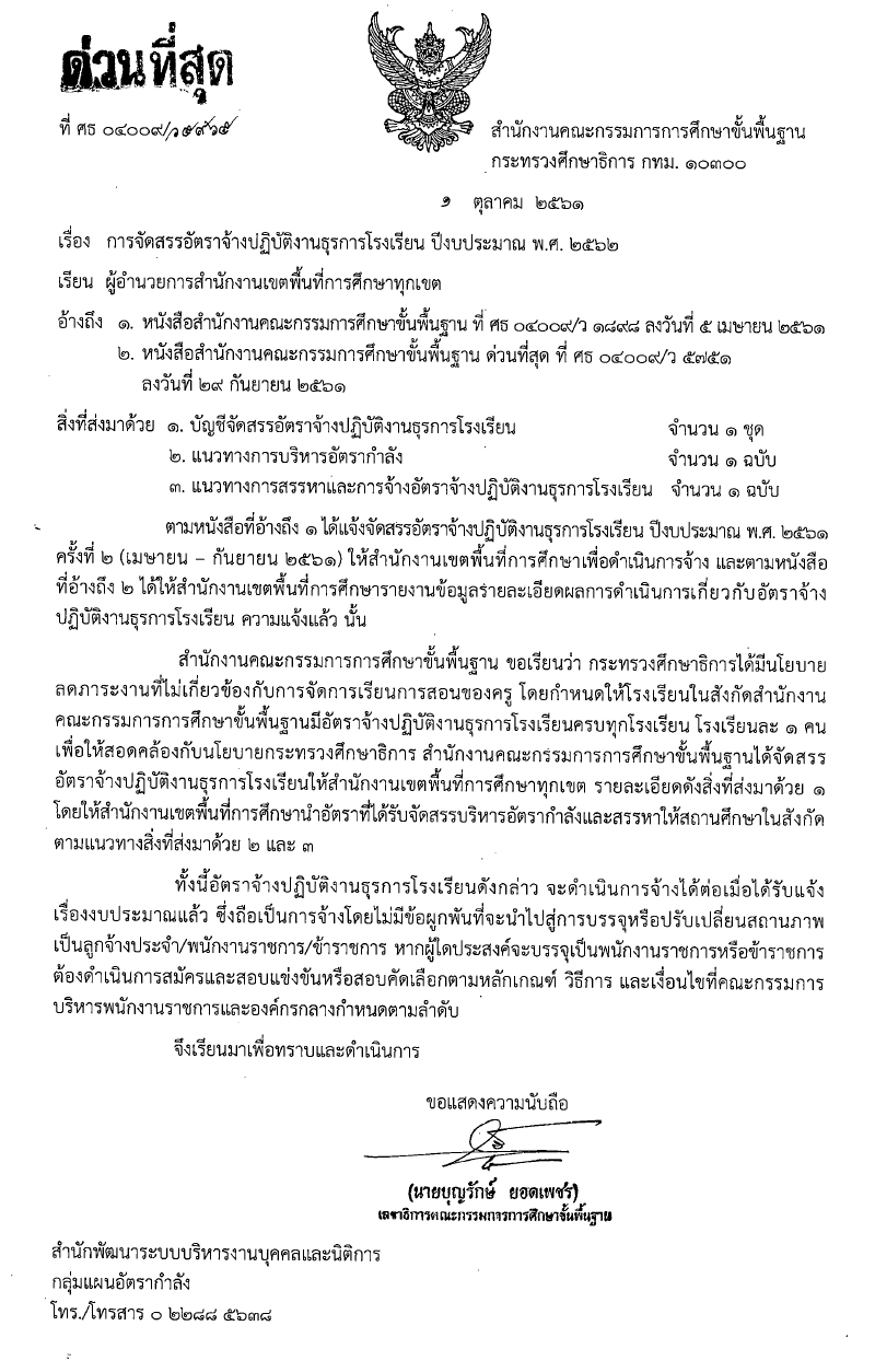 ด่วนที่สุด ที่ ศธ 04009/ว5965 ลงวันที่ 1 ตุลาคม 2561 เรื่อง การจัดสรรอัตราจ้างปฏิบัติงานธุรการโรงเรียน ปีงบประมาณ พ.ศ.2562