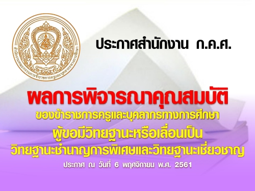 ประกาศสำนักงาน ก.ค.ศ. เรื่อง ผลการพิจารณาคุณสมบัติของข้าราชการครูและบุคลากรทางการศึกษา ผู้ขอมีวิทยฐานะหรือเลื่อนเป็นวิทยฐานะชำนาญการพิเศษและวิทยฐานะเชี่ยวชาญ