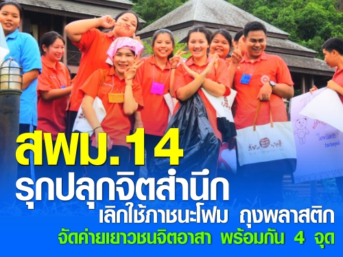 สำนักงานเขตพื้นที่การศึกษามัธยมศึกษา เขต 14 ( พังงา ภูเก็ต ระนอง) จัดกิจกรรมค่ายเยาวชนจิตอาสา สร้างจิตสำนึก เลิกใช้ภาชนะโฟมและถุพลาสติก เป็นมิตรกับสิ่งแวดล้อม ระหว่างวันที่ 8-9 พฤศจิกายน 2561 โดยมีพิธีเปิดพร้อมกัน 4 จุด 3 จังหวัด พังงา ภูเก็ตและระนอง