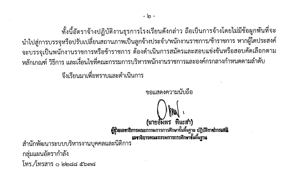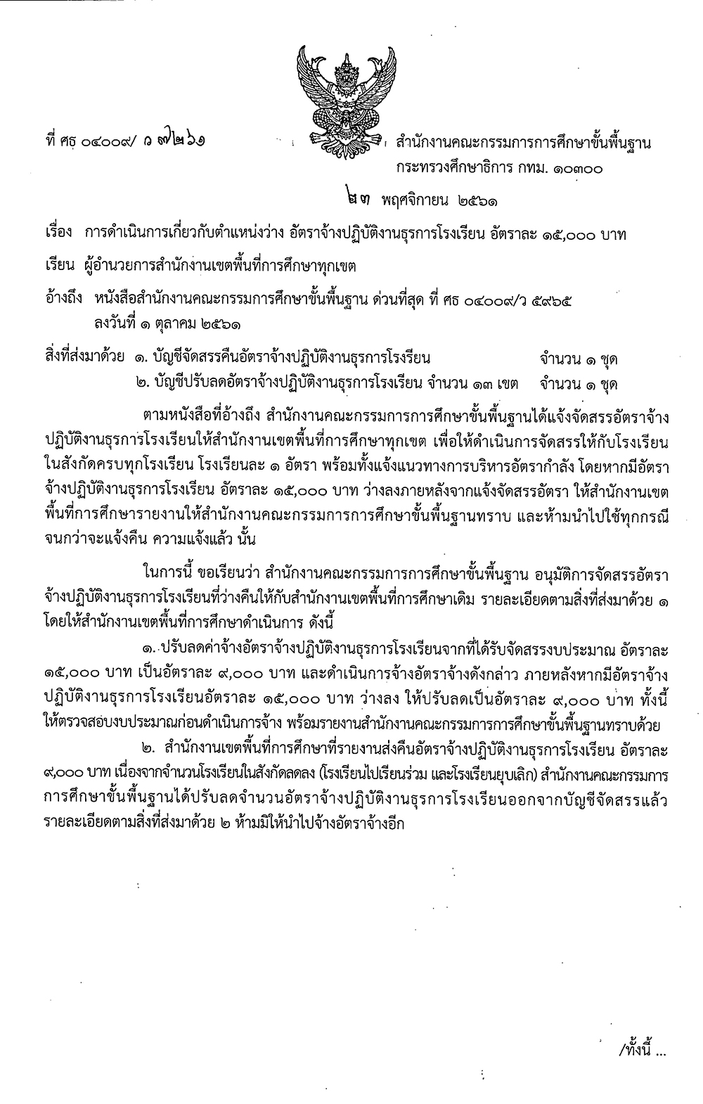 ที่ ศธ 04009/ว 7261 เรื่อง การดำเนินการเกี่ยวกับตำแหน่งว่างอัตราจ้างปฏิบัติงานธุรการโรงเรียนอัตราละ 15,000 บาท